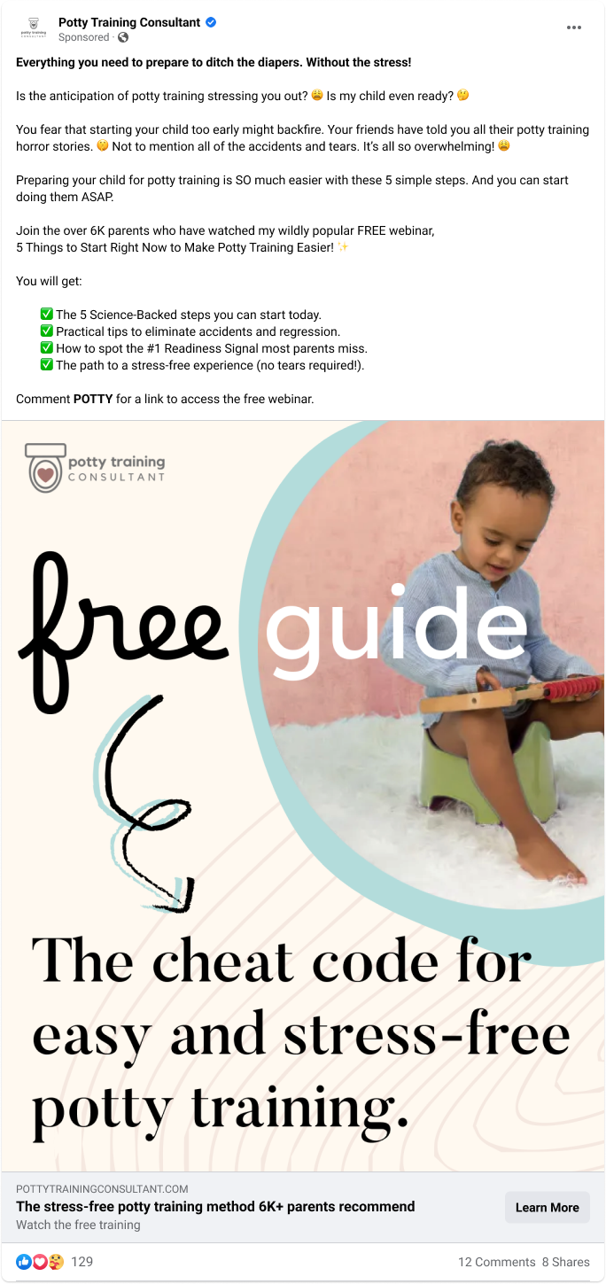 Solution: I wrote conversational and empathetic ad copy that spoke directly to parents' biggest fears and frustrations. The webinar was positioned as the stress-free solution. Strong social proof (6K+ parents) eased objections, while a low-friction CTA ("Comment POTTY") maximized engagement by making it easy for parents to access the training instantly.